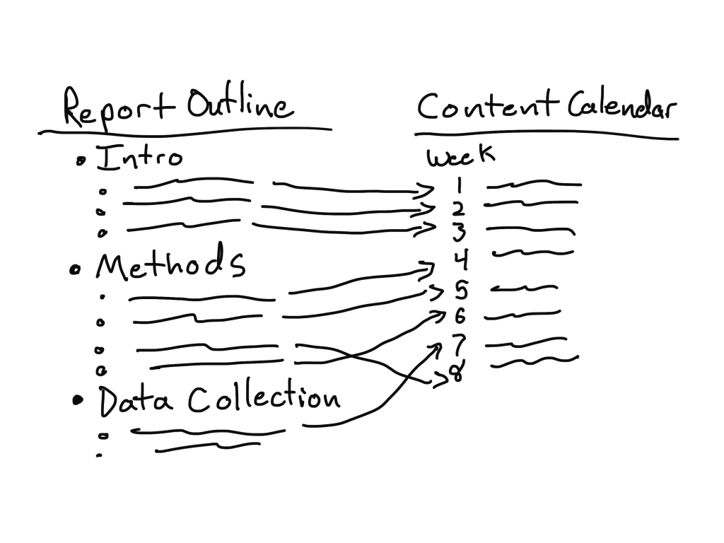 Your goal with a content calendar is to turn the report into something that gets shared over time. The simplest way to plan those posts is to just take your report outline and add some dates. Then use your schedule to plan your posts.
